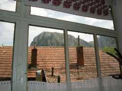 Az ablakon kinézve Székelykö hivogatja a turistákat egy hegyi túrára.